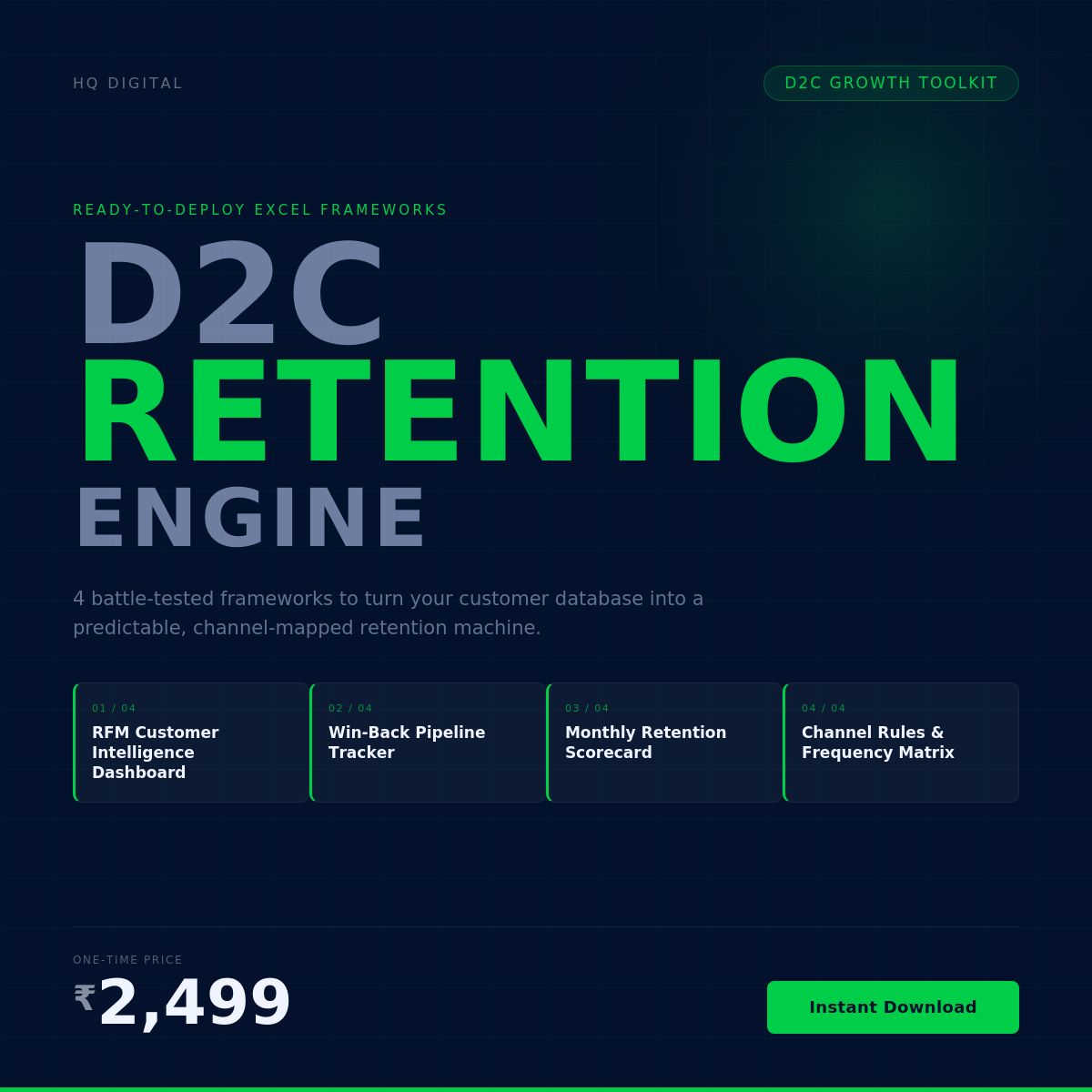 Complete D2C retention operating system: RFM Dashboard, Win-Back Tracker, Retention Scorecard, Channel Matrix, Trigger Calendar, and Flow Architecture Map.