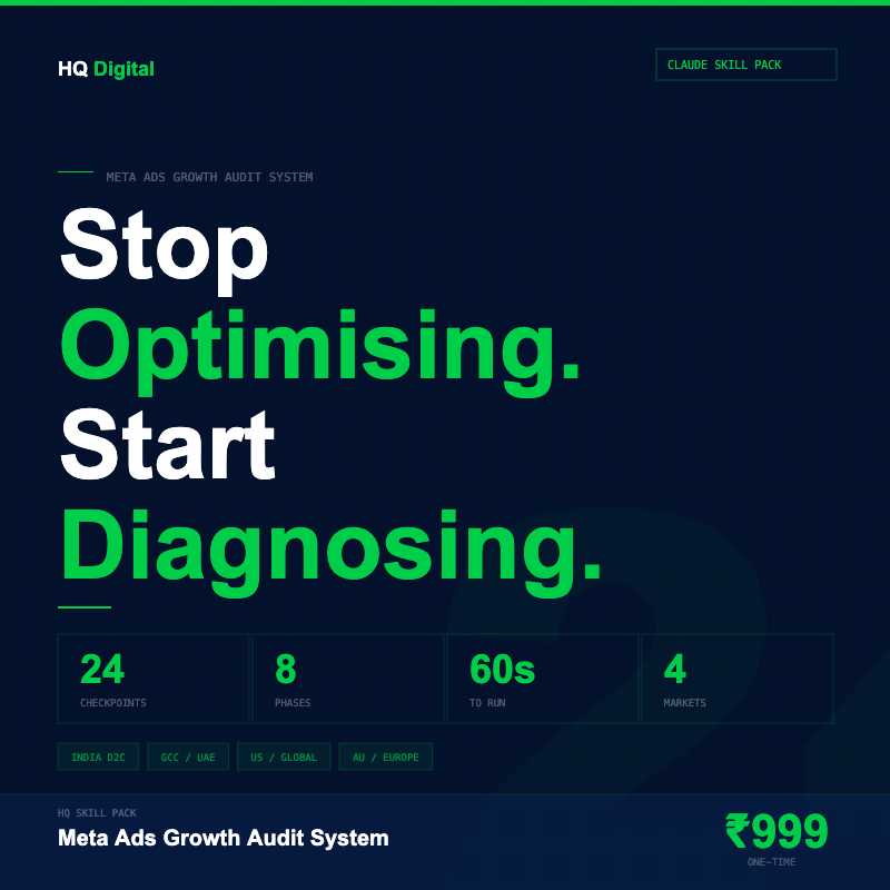 The complete 24-checkpoint Meta Ads diagnosis framework. 8 phases covering business economics, funnel architecture, signal economy, creative strategy, catalog systems, campaign structure, performance diagnosis, and scaling readiness. Includes benchmarks for India D2C, GCC/UAE, US/Global, and Australia/Europe. Built by Apurv Singh | HQ Digital.